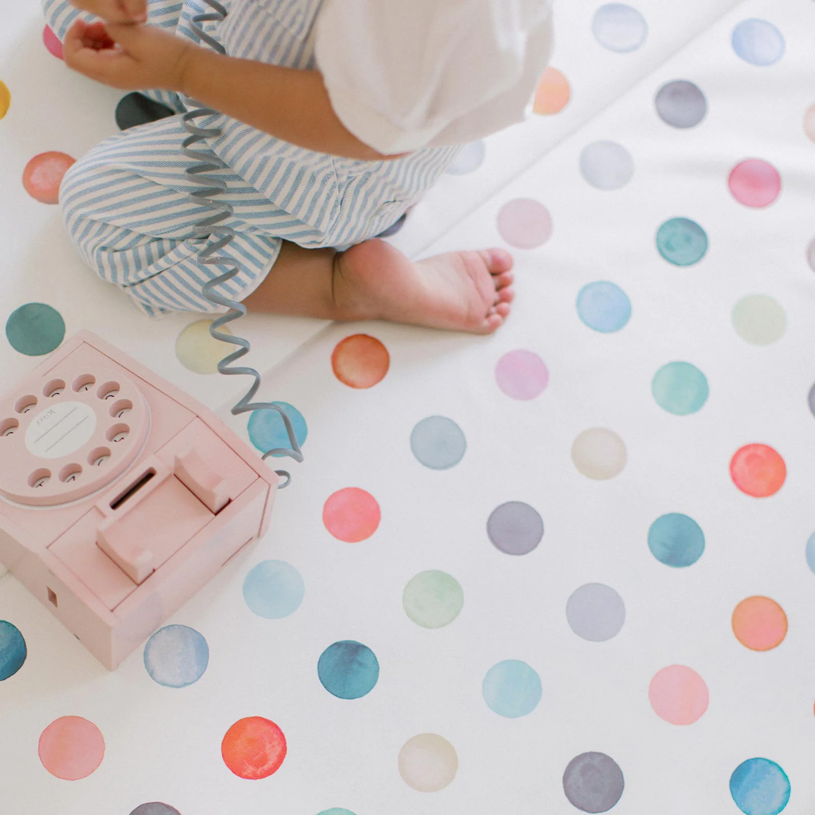 The Dottie print in the color "Gloria" features watercolor rainbow dots on a white base.